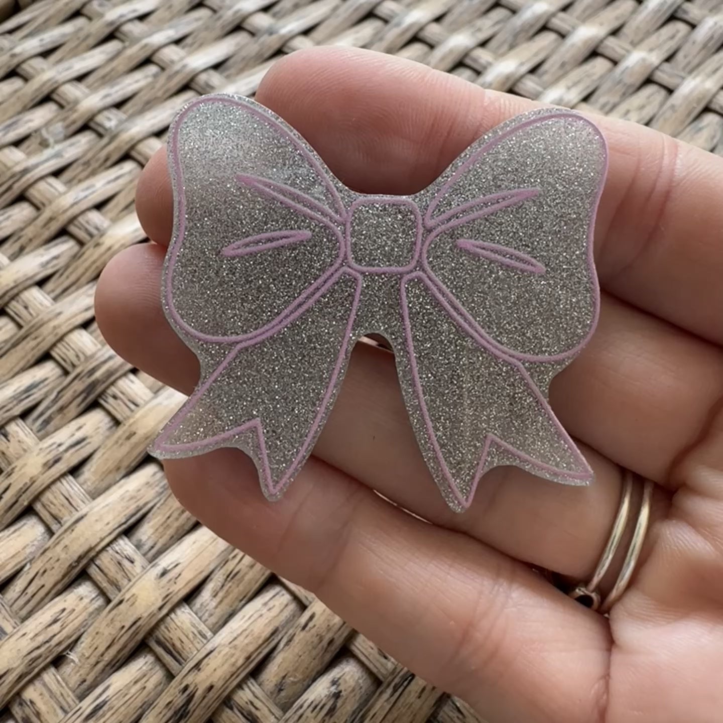 Silver Bow with Pink Outline, Glitter Flatback, Planar, Cabochon, Single Pc