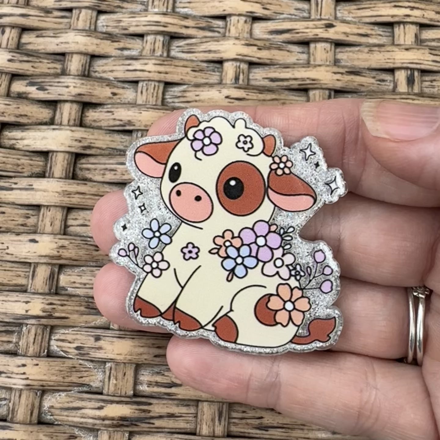 Cute Cow with flowers, Glitter Flatback, Planar, Cabochon, Single Pc