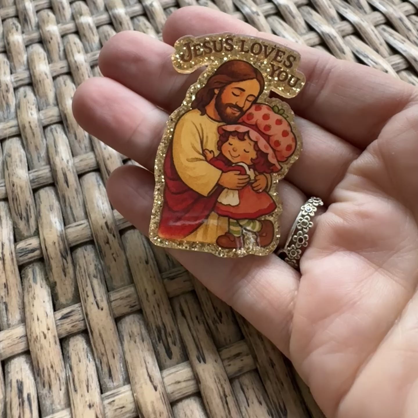 Jesus Loves Me Strawberry Shortcake- Glitter Flatback, Single Pc.