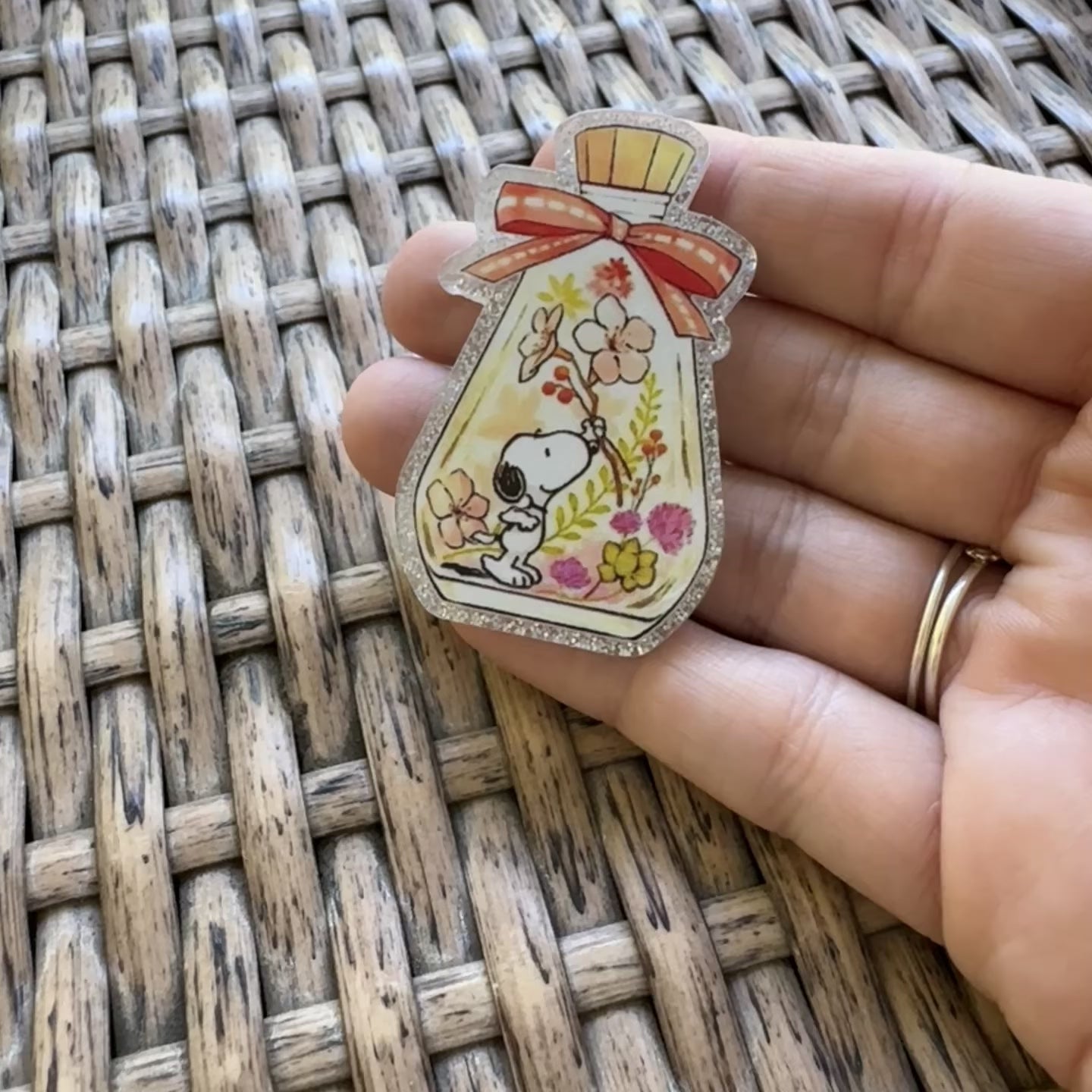 Snoopy in a bottle with flowers Acrylic Flatback Planar, Cabochon, Single Pc.