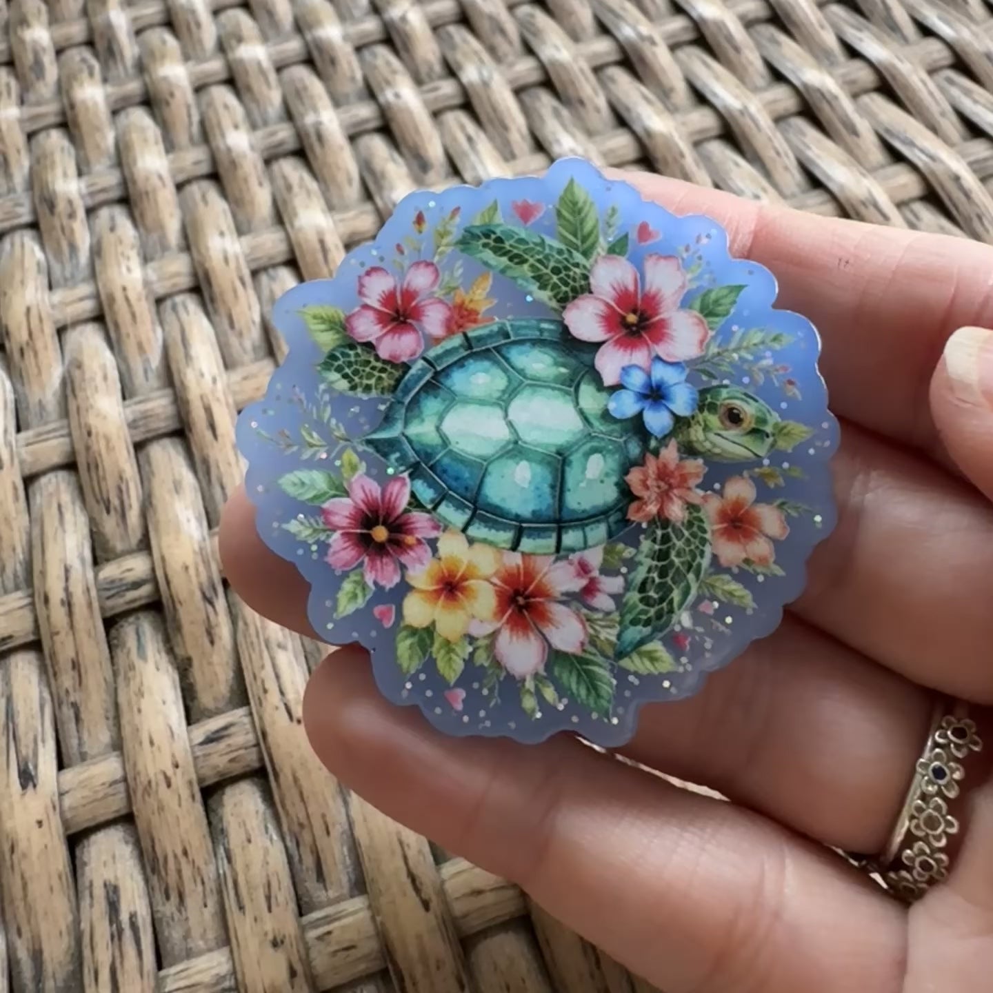 Sea Turtle and Flowers- Glitter Flatback, Single Pc.