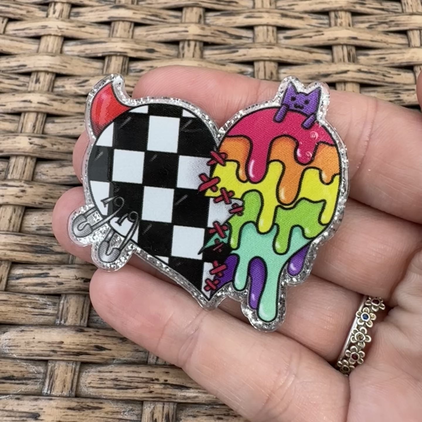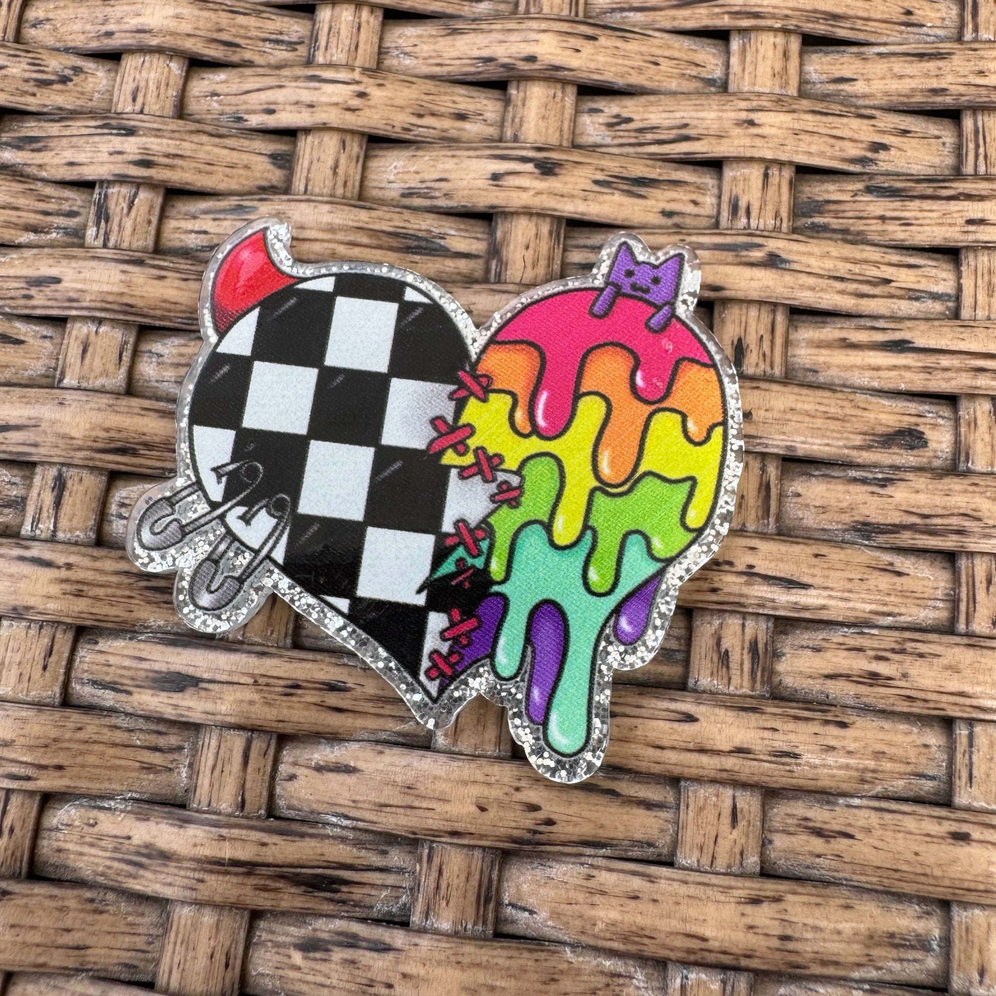 Colorful Checkered heart. Glitter Flatback, Planar, Cabochon, Single Pc