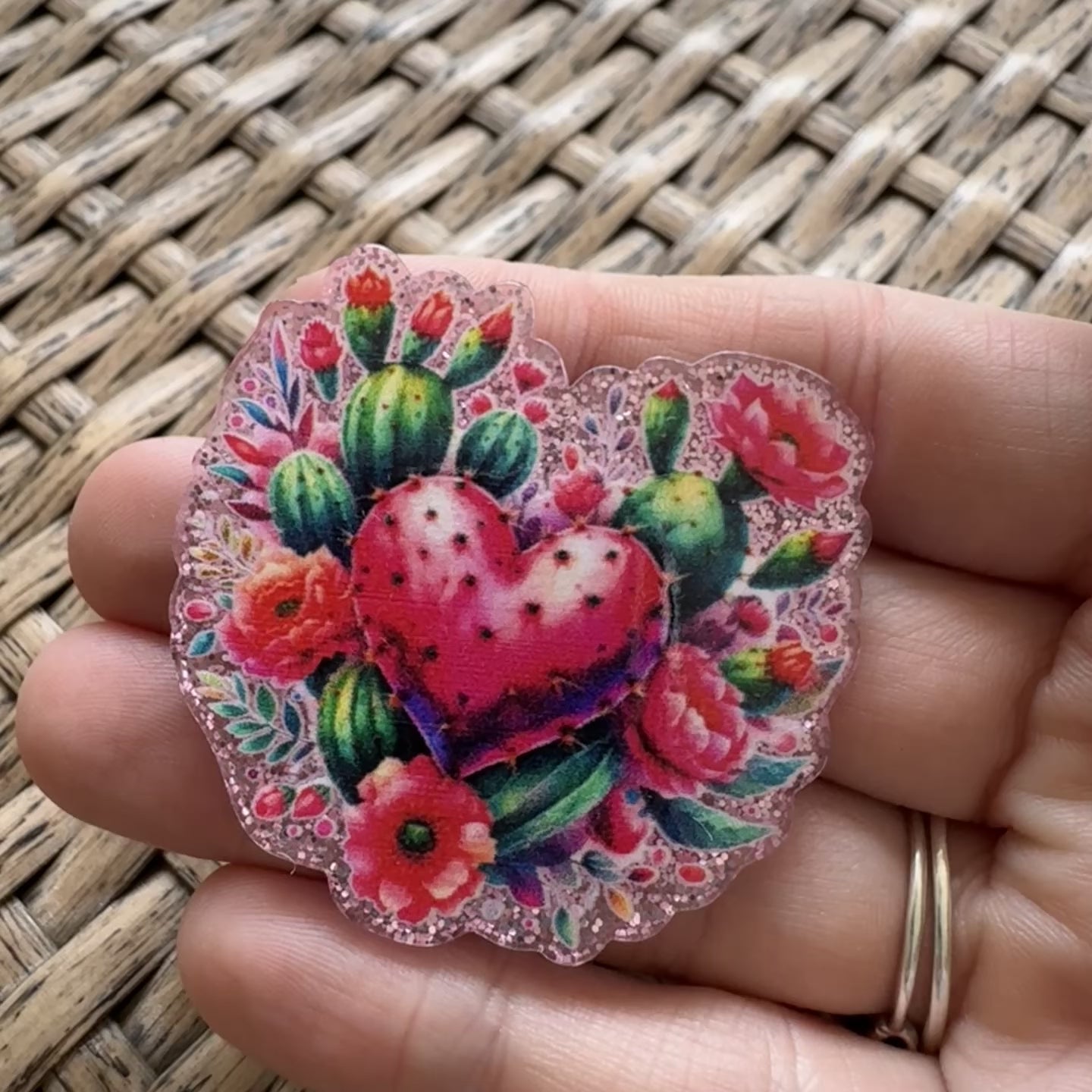 Cactus and Heart, Glitter Flatback, Planar, Cabochon, Single Pc